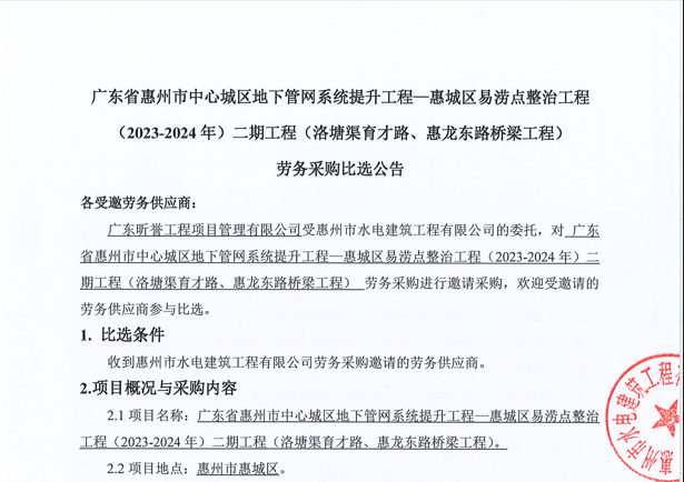 廣東省惠州市中心城區(qū)地下管網(wǎng)系統(tǒng)提升工程-內(nèi)街小巷排水管網(wǎng)病害修復及錯混接改造項目一期施工勞務(wù)采購(第二次)中選候選人公示……